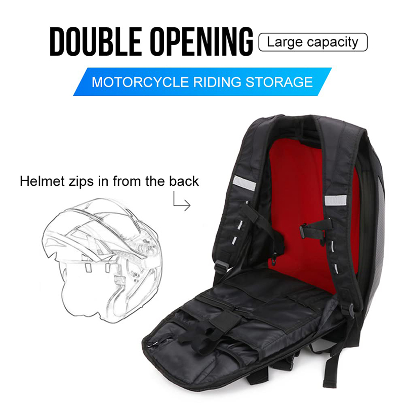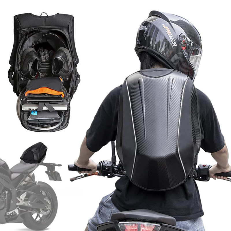 HIGH QUALITY MATERIAL - The motorcycle backpack is made of carbon fiber, PVC/1680D Oxford. Rugged, water-resistant nylon construction with reinforced carbon fiber PVC body and lid to hold shape even when empty. It also provides some protection for your back in the event of a fall.